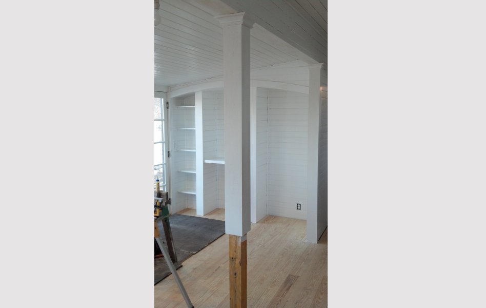 The owners of this 1890s island cottage near Boothbay Harbor, Maine wanted light and space in what had originally been a "maid's kitchen." An assortment of small, dark spaces were brought together, and bands of sympathetically proportioned windows were added, using minimal structure between windows in order to evoke the island's vernacular cottage style.